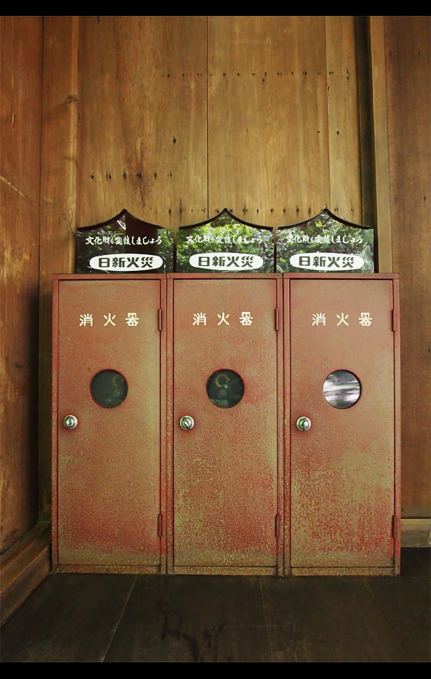 色あせたのかわざとなのか、古い建物に馴染んだ消化器。